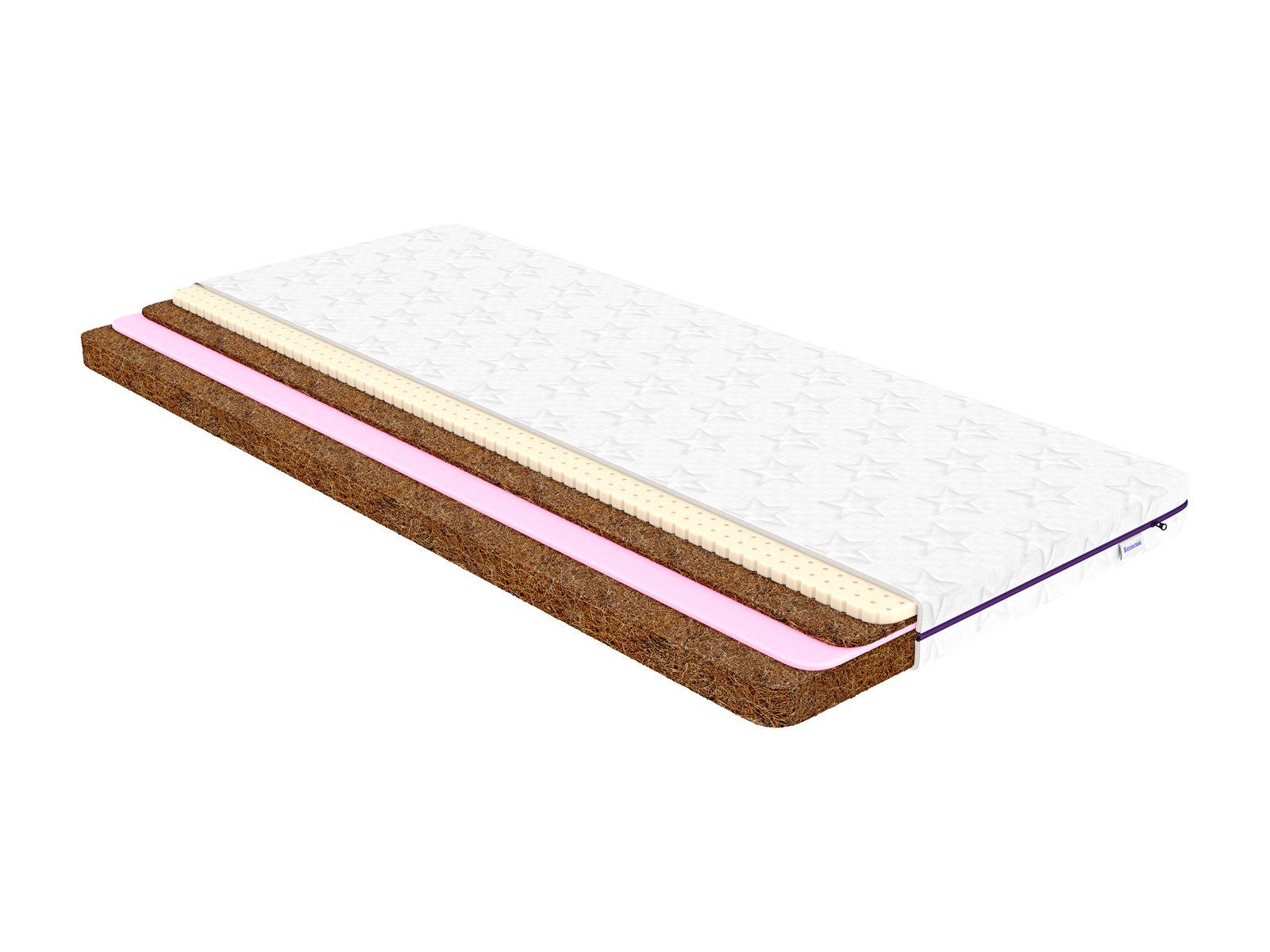 Самая жёсткая сторона реализована при помощи 6 см кокосового слоя. Это твёрдый натуральный материал, который великолепно поддерживает спину. Более мягкая поверхность представлена комбинацией тонкого слоя кокоса и плитой из натурального латекса. Кокос сохраняет правильную поддержку для позвоночника, а латекс делает поверхность мягкой и адаптивной. Пена ППУ установлена в центре матраса и отвечает за поглощение и распределение нагрузки. Мягкий слой работает как мини-пружинный блок, позволяя матрасу ещё лучше адаптироваться под линии фигуры ребёнка.