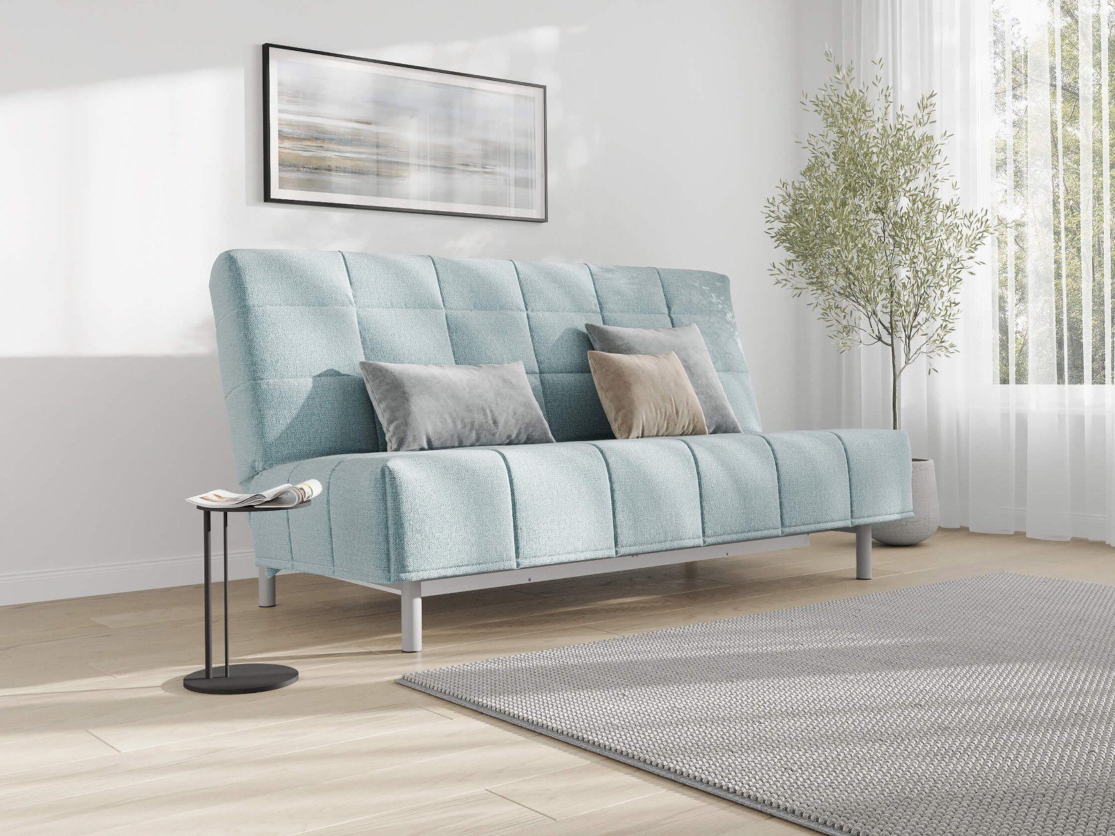 Диван для сна в современном стиле с механизмом трансформации «клик-кляк» и коробом для хранения. Основание дивана металлическое, с ламелями. Матрас анатомический с независимым пружинным блоком. Благодаря съемному чехлу с объемной стежкой в форме квадратов, диван органично впишется в современные интерьеры в стиле минимализм. Благодаря отсутствию подлокотников у дивана минимальные габариты как в сложенном, так и разложенном виде.