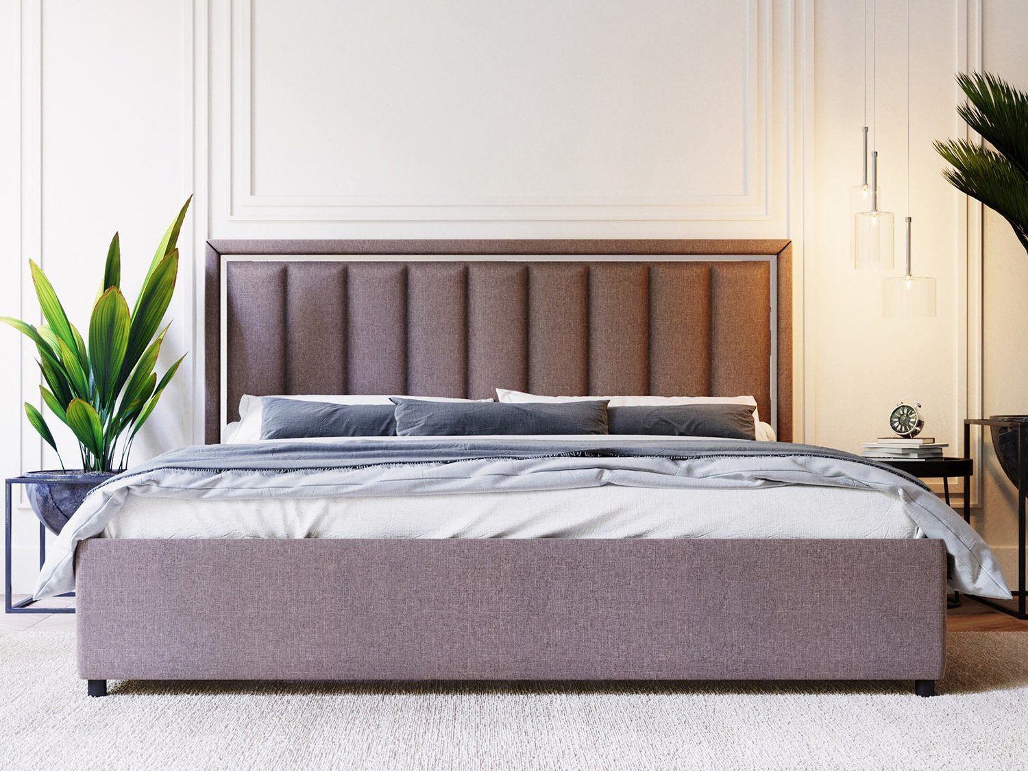 Вивальди — изящная кровать в современном стиле. Изюминка модели — высокое мягкое изголовье с вертикальными стяжками и зеркальной вставкой по периметру, которая создает яркие блики на свету.
