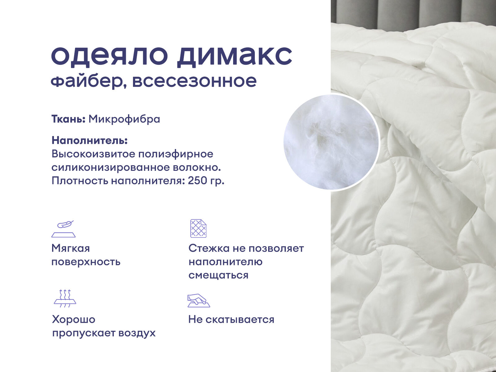 Ваш идеальный спутник для сладких снов круглый год! Забудьте о мучительном выборе между летним и зимним вариантами. Одеяло Димакс Файбер – это универсальное решение, которое подарит комфортный сон как в морозную зиму, так и тёплым летом. Его секрет – в уникальном сочетании высококачественных материалов и продуманном наполнителе. Гипоаллергенный файбер состоит из крошечных пружинок полиэфира, которые создают комфортную, воздушную и тёплую структуру. Одеяло можно стирать в деликатном режиме в стиральной машине.