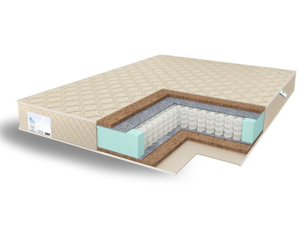 Внутри модели распределение слоёв устроено таким образом, что между двумя одинаковыми плитами койры скрыт пружинный блок TFK. Работает такой блок полностью независимо в каждой из своих зон, что обеспечивает матрас ортопедическими качествами. Для того, чтобы усилить эффект и распределить нагрузку сверху и снизу пружин установили слои кокоса.