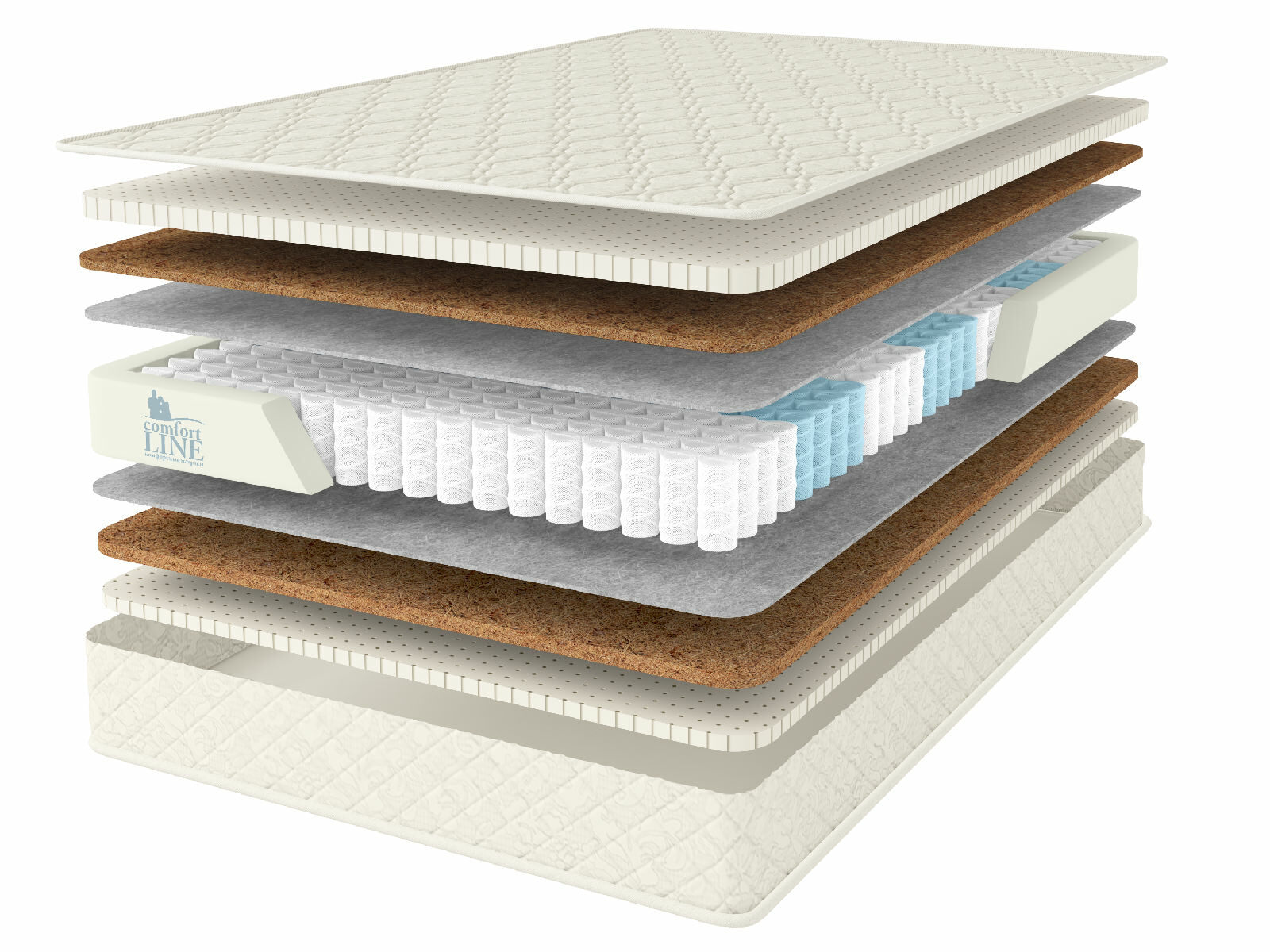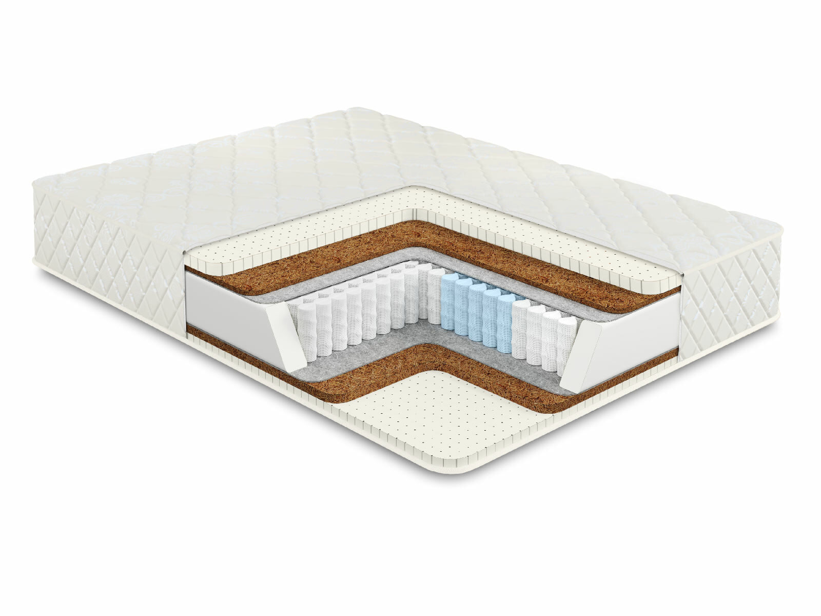 Латекс представляет собой эластичную перфорированную плиту толщиной 3 см. Он даёт мягкость и приятную эластичность, что позволяет матрасу подстраиваться пода анатомию. Койра – это более тонкая 1 см плита высокой степени жёсткости. Её задача заключается в естественной поддержке для позвоночника.