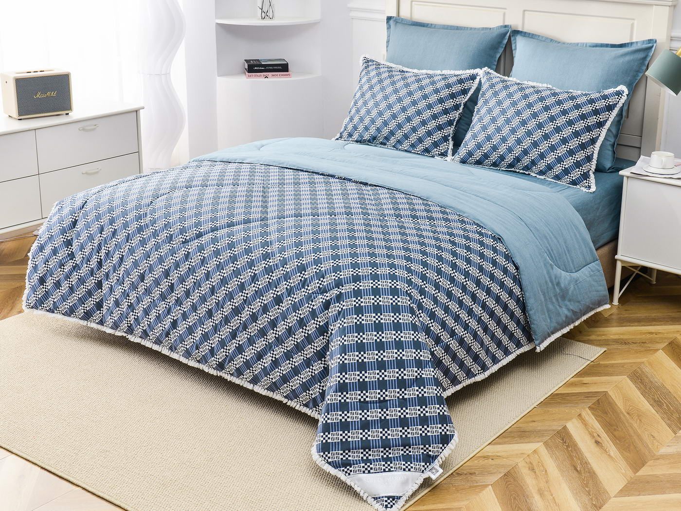 В комплекты комфортеров с одеялом Бернадетт входят наволочки, простыня и легкое всесезонное одеяло. Оцените это современное и очень удобное решение, которое идеально подходит тем, кто не любит возиться с пододеяльниками.