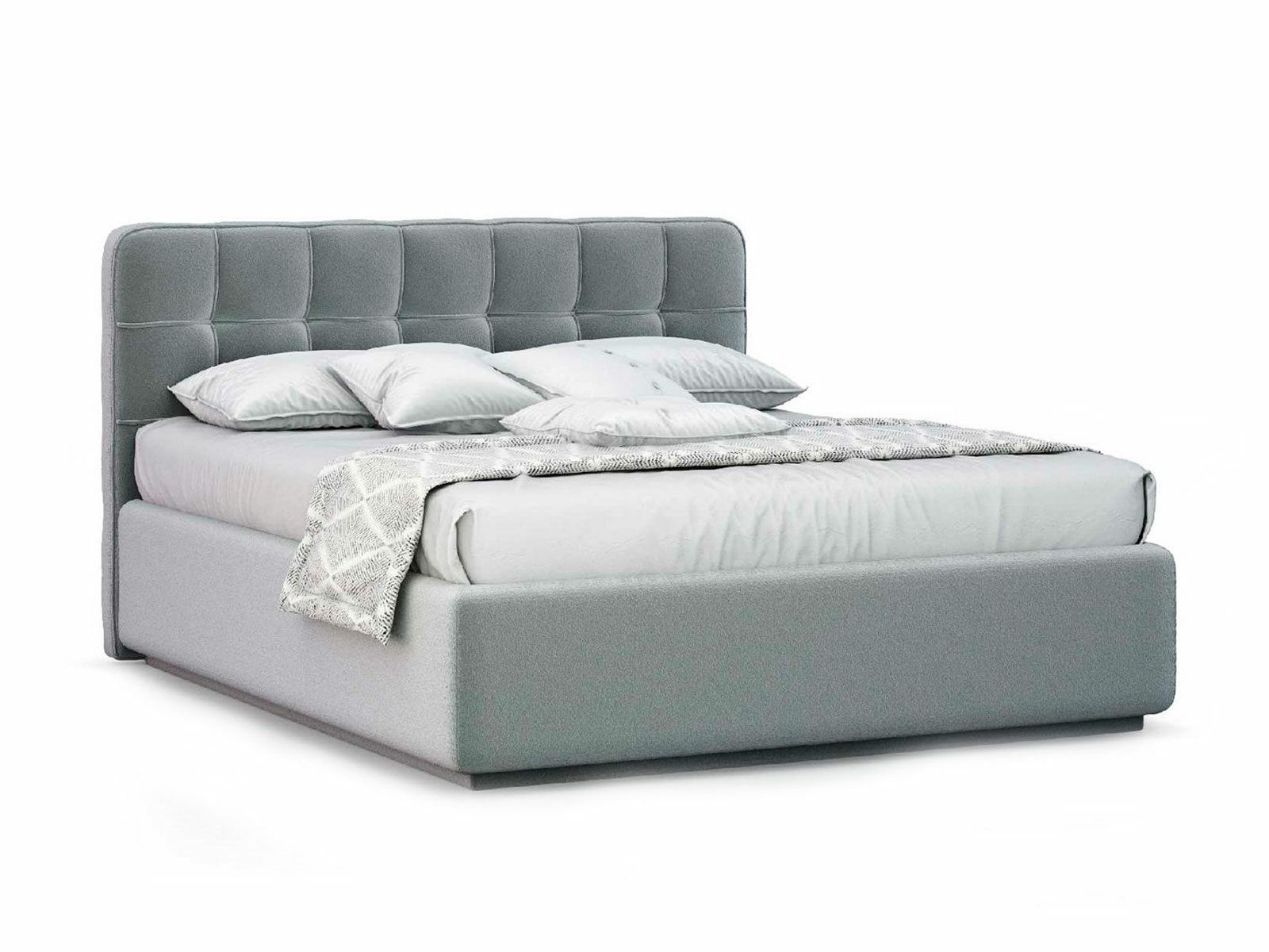Кровать укомплектована IQ с подъемным механизмом и ящиком для белья без дна (дополнительная платная опция - дно к ящику IQ из HDF (ХДФ). Каркас кровати на цоколе, декоративный чехол на цоколе съёмный. Глубина ящика для белья - 30 см, без ограничения нагрузки на ящик.