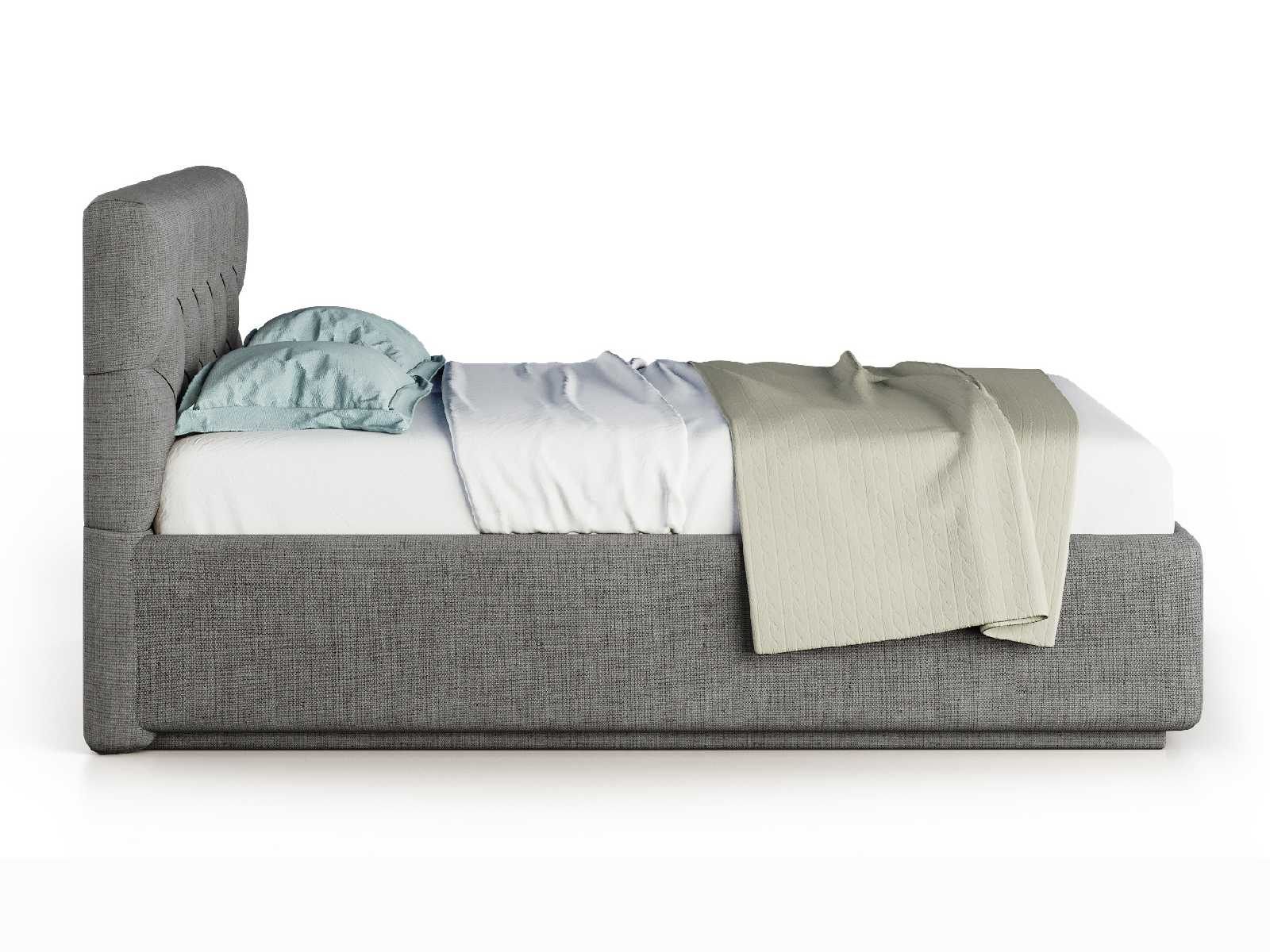 Кровать укомплектована IQ с подъемным механизмом и ящиком для белья без дна (дополнительная платная опция - дно к ящику IQ из HDF (ХДФ). Каркас кровати на цоколе, декоративный чехол на цоколе съёмный. Глубина ящика для белья - 30 см, без ограничения нагрузки на ящик.