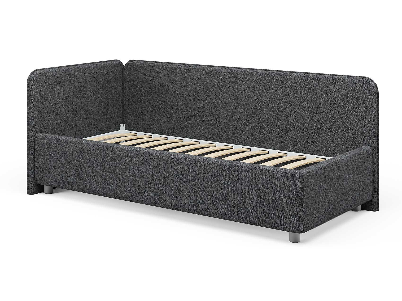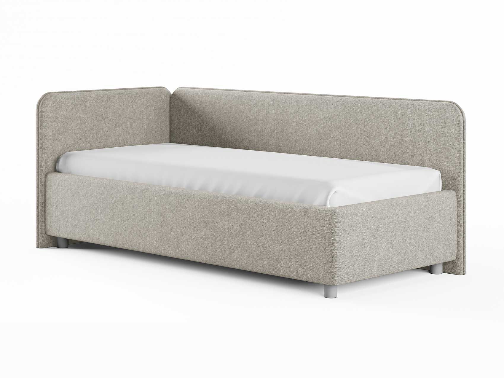 Односпальная кровать в современном стиле. Кровать-софа с одной боковой спинкой. Идеально подходит для квартир с небольшой площадью, детских и подростковых спален, гостевых комнат. Боковую спинку кровати можно изготовить на выбор на правую или левую сторону. Модель изготовлена из ДСП. При необходимости, кровать можно укомплектовать подъемным механизмом с бельевым ящиком.