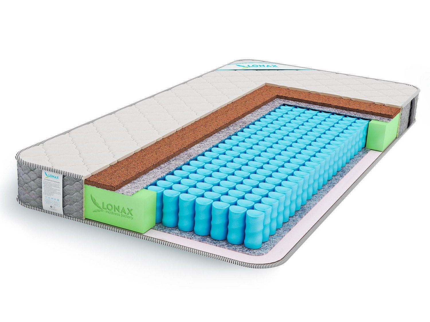 В основе модели - блок независимых пружин TFK Light (210 штук на квадратный метр). Наполнителем для одной стороны послужил экологически чистый натуральный материал из кокосовых волокон, обладающий такими качествами, как жесткость и упругость. С другой стороны находится слой спанбонда, предназначенный для защиты чехла от воздействия металлических пружин.