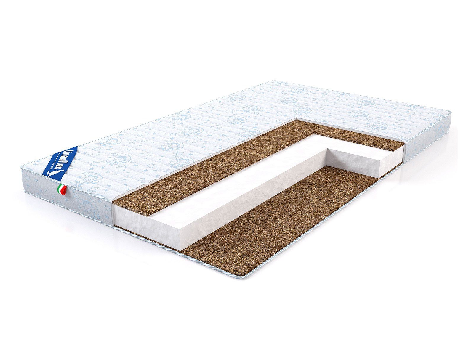 Для обивки матраса используется жаккард. Материал устойчиво переносит нагрузки и отличается увеличенным сроком службы, что особенно актуально для детских изделий. Чехол украшает нежный принт в бело-голубой гамме, который благодаря своей ненавязчивости деликатно впишется в любой дизайн интерьера.