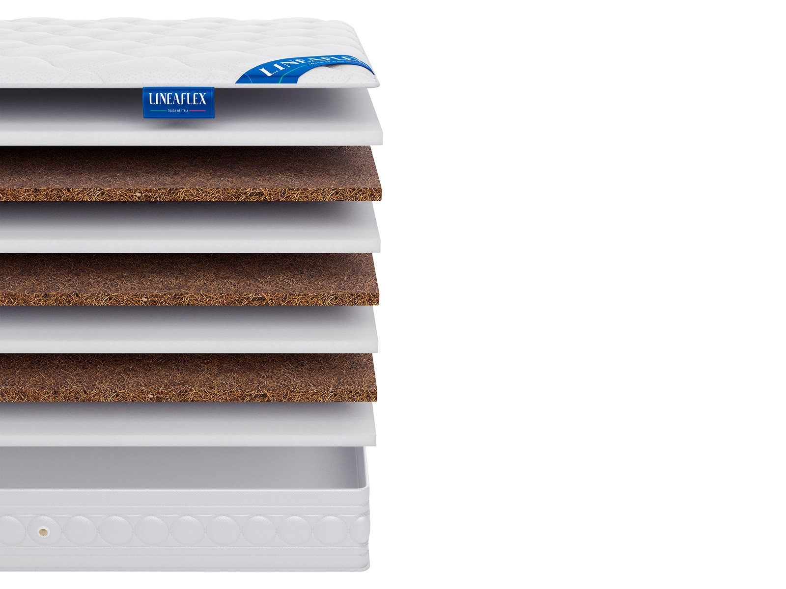 Матрас построен путём чередования двух видов материалов: ERGOFLEX и натуральной кокосовой койры. Если снять чехол, то сбоку такое изделие напомнить пышный слоёный торт, только «коржами» будут выступать прочная койра и мягка пена.
