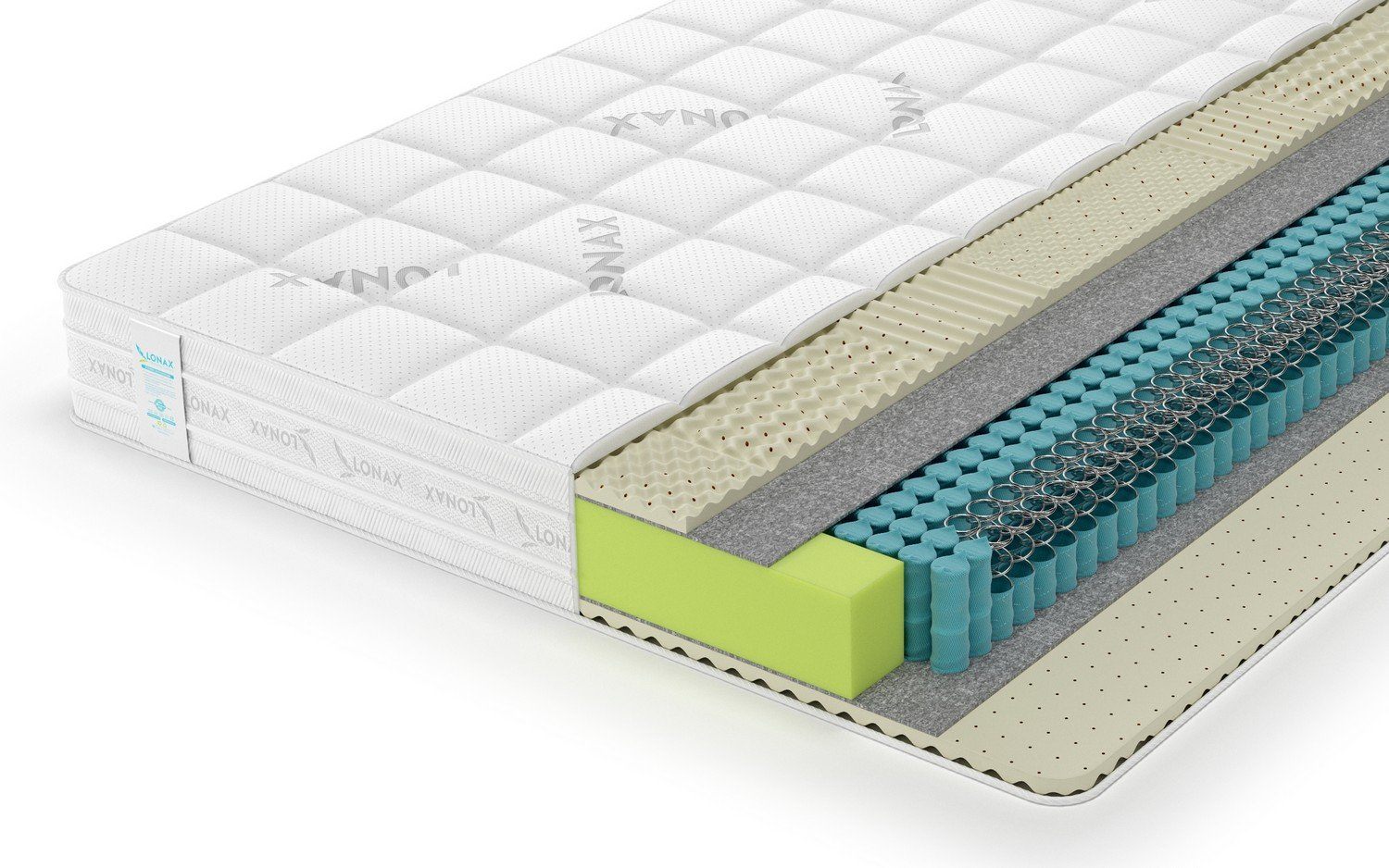 Слои латексной пены также имеют специальную структуру. Полотно наполнителя поделено на 7 зон, где каждая из областей имеет собственную плотность и разновидность фигурной резки. Сделано это для того, чтобы более качественно адаптироваться под фигуру. Например, в местах с наибольшей нагрузкой, где приходятся бёдра и плечи, пена получила более интенсивную плотность.