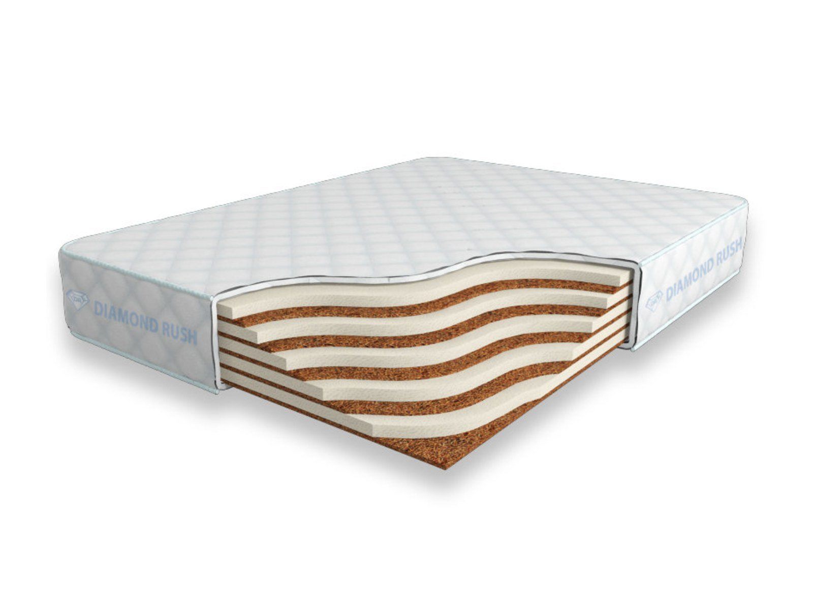 Матрас Diamond Rush Mix Cocos 20 SD является беспружинным, т.е. не имеет в своей основе пружинного блока. В его состав входят одно или несколько чередований слоев латексированной кокосовой койры (1см) и искусственного латекса (3см). Такая модель матраса обладает средним ортопедическим эффектом и имеет разные по жесткости стороны.