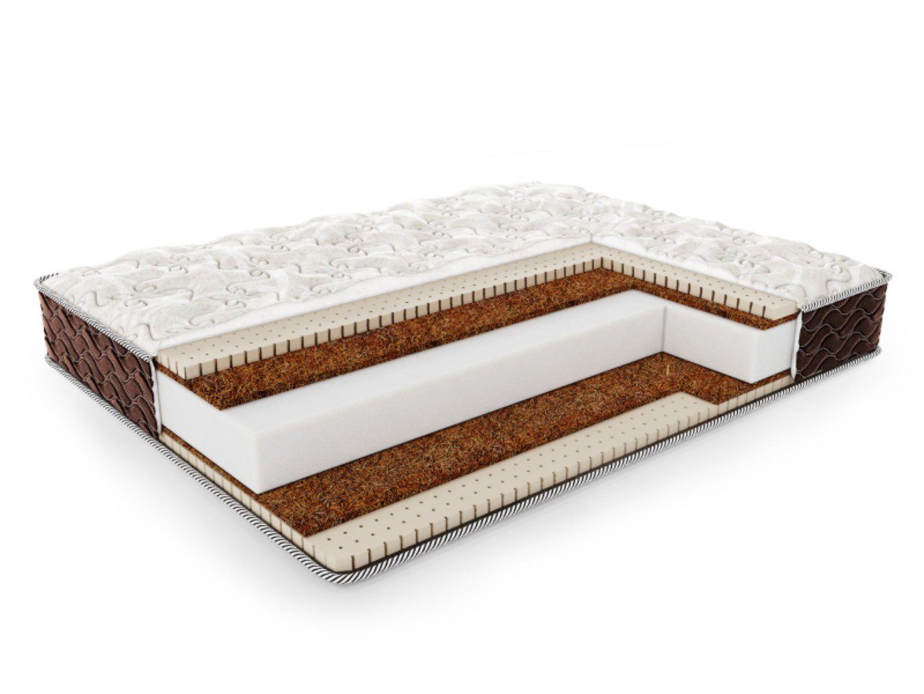 С каждой из сторон матраса расположилась комбинация из двух классических материалов, таких как койра кокоса и натуральный латекс. Толщина кокосового слоя соответствует 1 см, а латекса – 2 см.