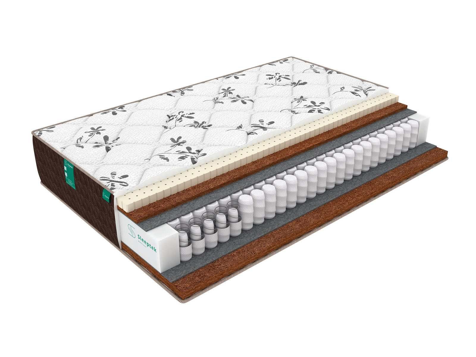 Ортопедическая модель Duplex LatexStrong Cocos на основе натуральных наполнителей, с различной жесткостью сторон. Основой матраса служи независимый пружинный блок Double Spring. Данный блок отличается от стандартных более высокой плотностью пружинок на квадратный метр, что достигается встраиванием в основную пружину еще одной, меньшего диаметра. Такая конструкция делает блок более прочным и значительно повышает его несущую способность. Работа пружин напрямую зависит от степени оказываемого на матрас давления. При небольшой нагрузке работают только основные пружины, чем выше становится нагрузка – тем больше внутренних пружин включается в работу. В итоге спящему обеспечивается оптимальная поддержка, точно отвечающая особенностям его сложения (весу и формам тела).Блок пружин отделен от наполнителей слоями термовойлока. Этот материал защищает койру и латекс от контакта с пружинами и продлевает срок службы матраса.