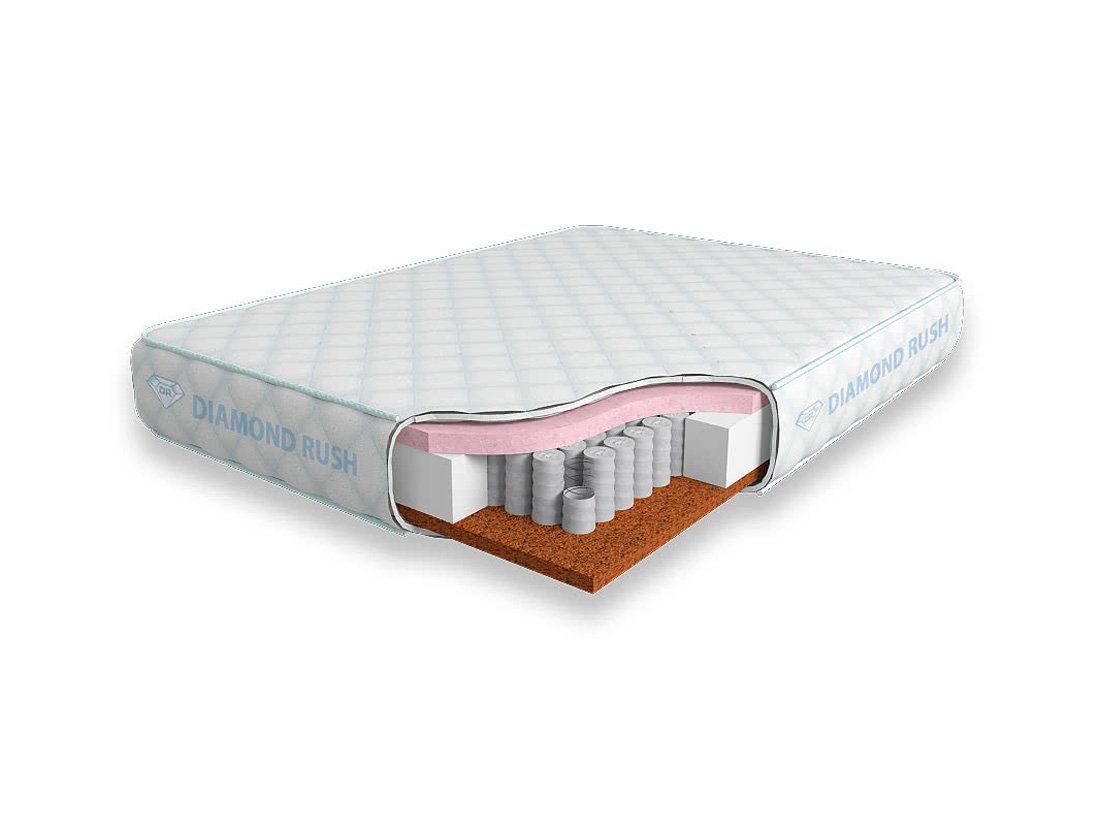 Матрас Diamond Rush Super Contrast 725DR имеет в своей основе независимый пружинный блок 725, состоящий из пружин диаметром 5-6 см. В качестве настилочных слоев поверх пружинного блока используются листы латексированной кокосовой койры и вязкоэластичного Меморикса, материала с эффектом памяти. Стороны матраса по жесткости имеют сильный контраст, одна жесткая, другая мягкая, как взбитая перина.