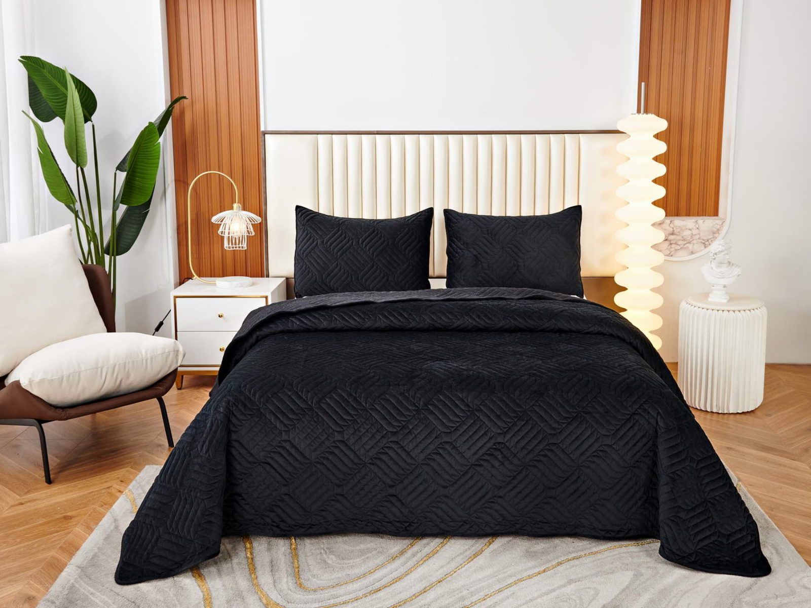 Покрывала выполнены в 10 оттенках: крем, мокко, пепельный, песочный, светло-бежевый, светло-серый, серый, темно-серый, чайная роза и черный. Стежка в виде геометрического орнамента подойдет к любому современному интерьеру. Из-за особого плетения, велюровая ткань покрывала отражает свет и красиво переливается при различном освещении.