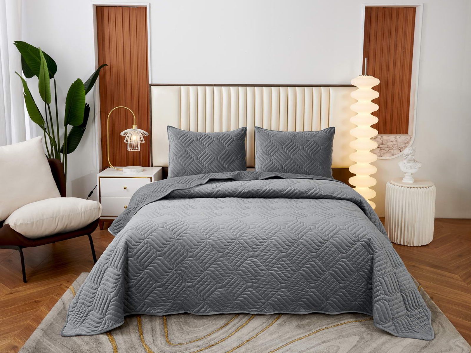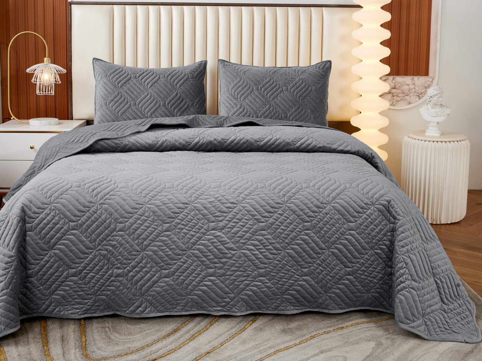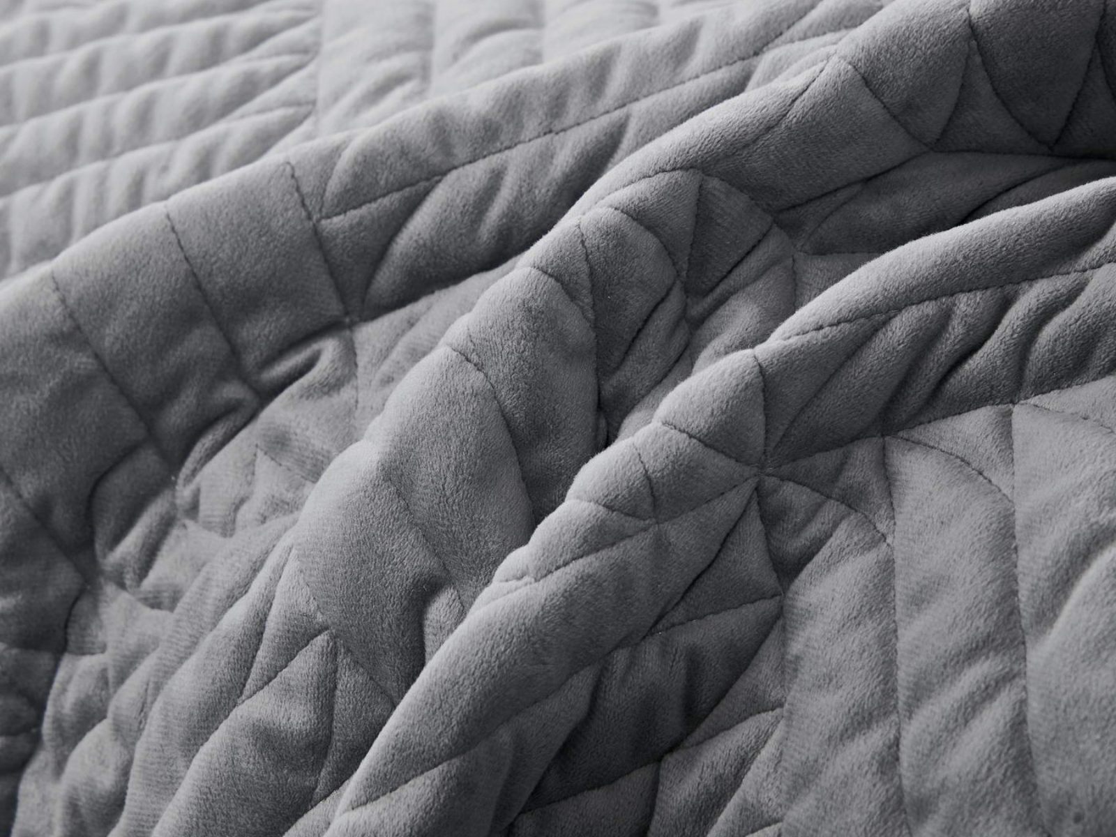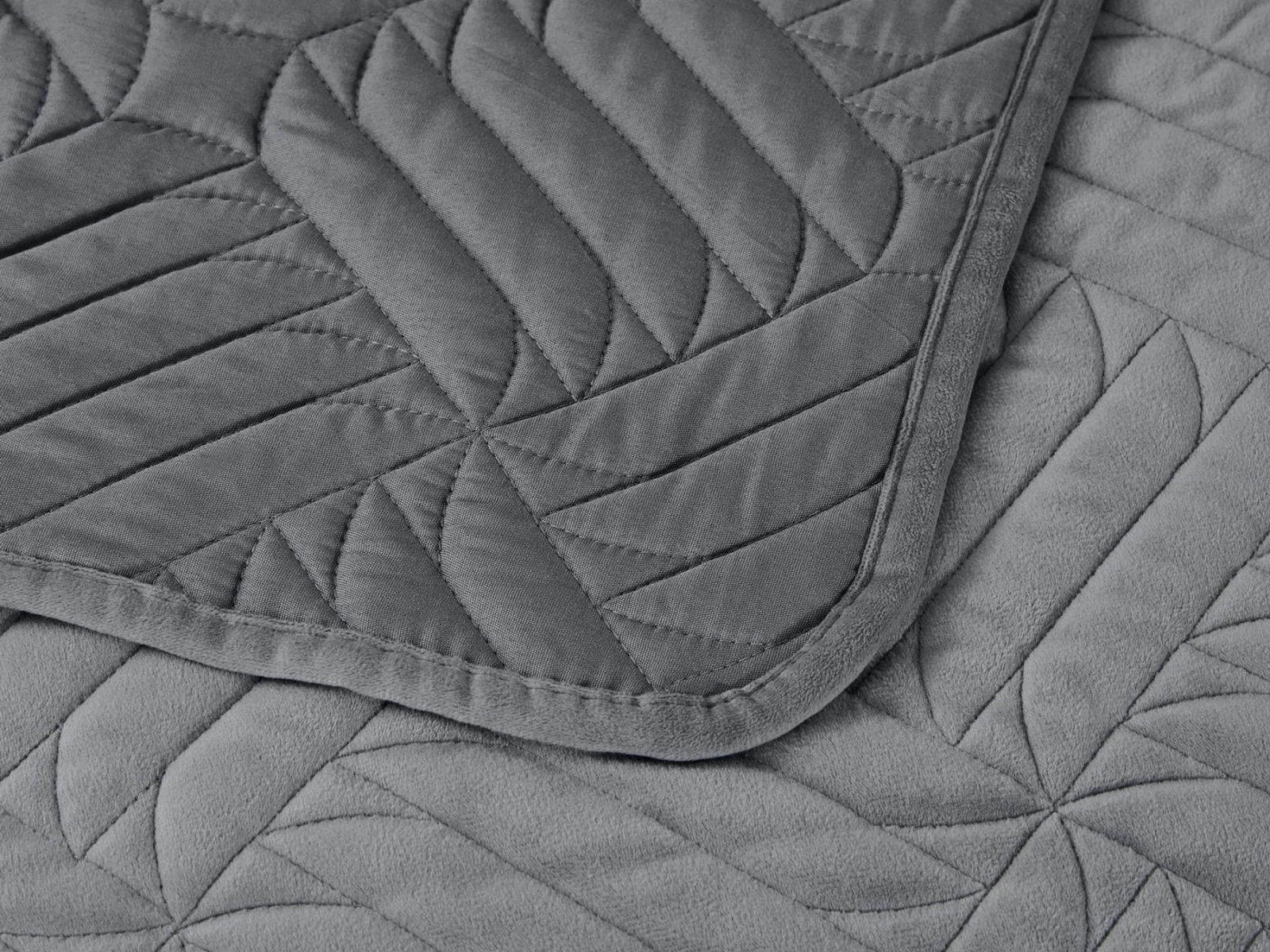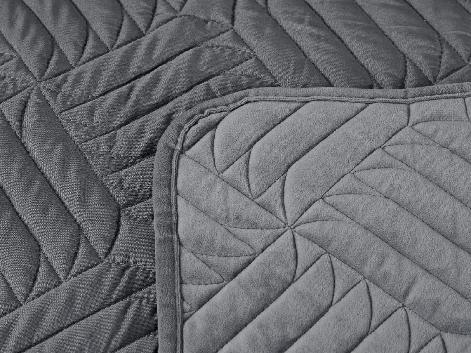 Покрывала выполнены в 10 оттенках: крем, мокко, пепельный, песочный, светло-бежевый, светло-серый, серый, темно-серый, чайная роза и черный. Стежка в виде геометрического орнамента подойдет к любому современному интерьеру. Из-за особого плетения, велюровая ткань покрывала отражает свет и красиво переливается при различном освещении.
