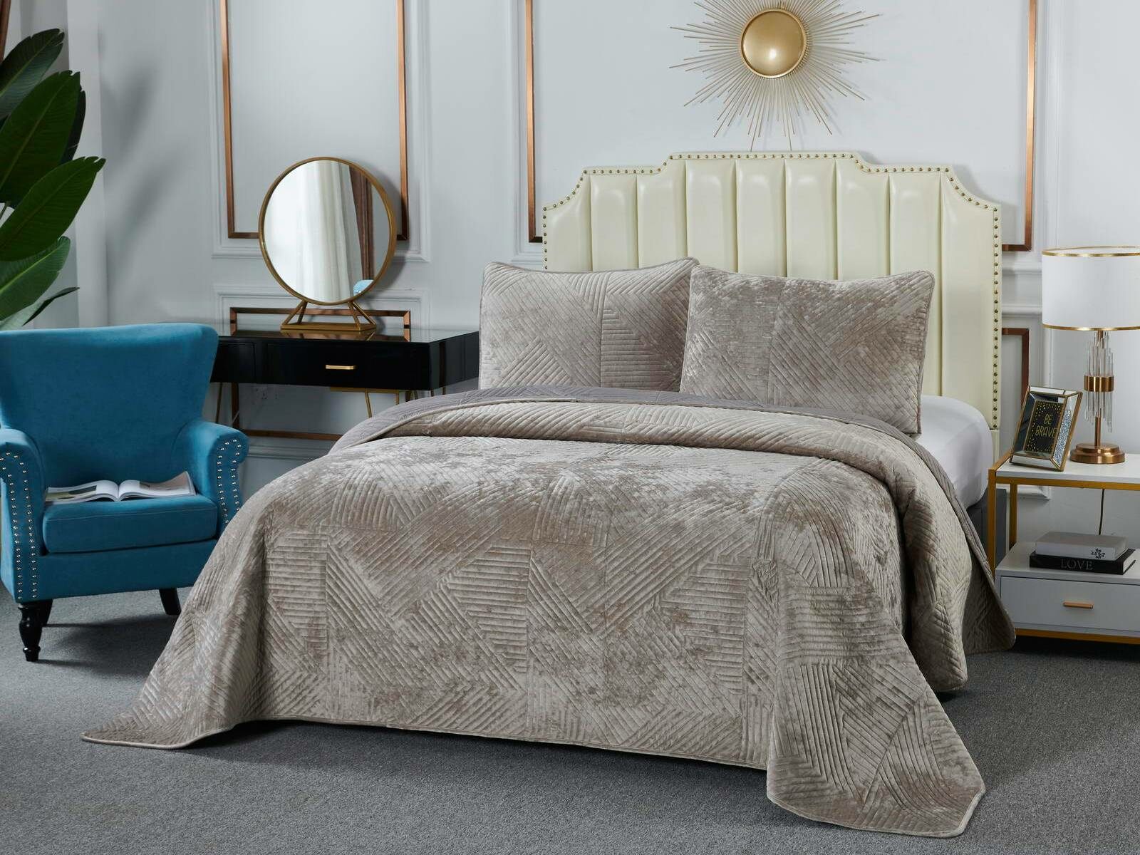 Покрывало украшает лаконичный геометрический орнамент. Геометрия всегда была и остаётся актуальной классикой. Конфигурация различных фигур, углов и линий позволяет им органично вписаться в самые разнообразные интерьерные стили.