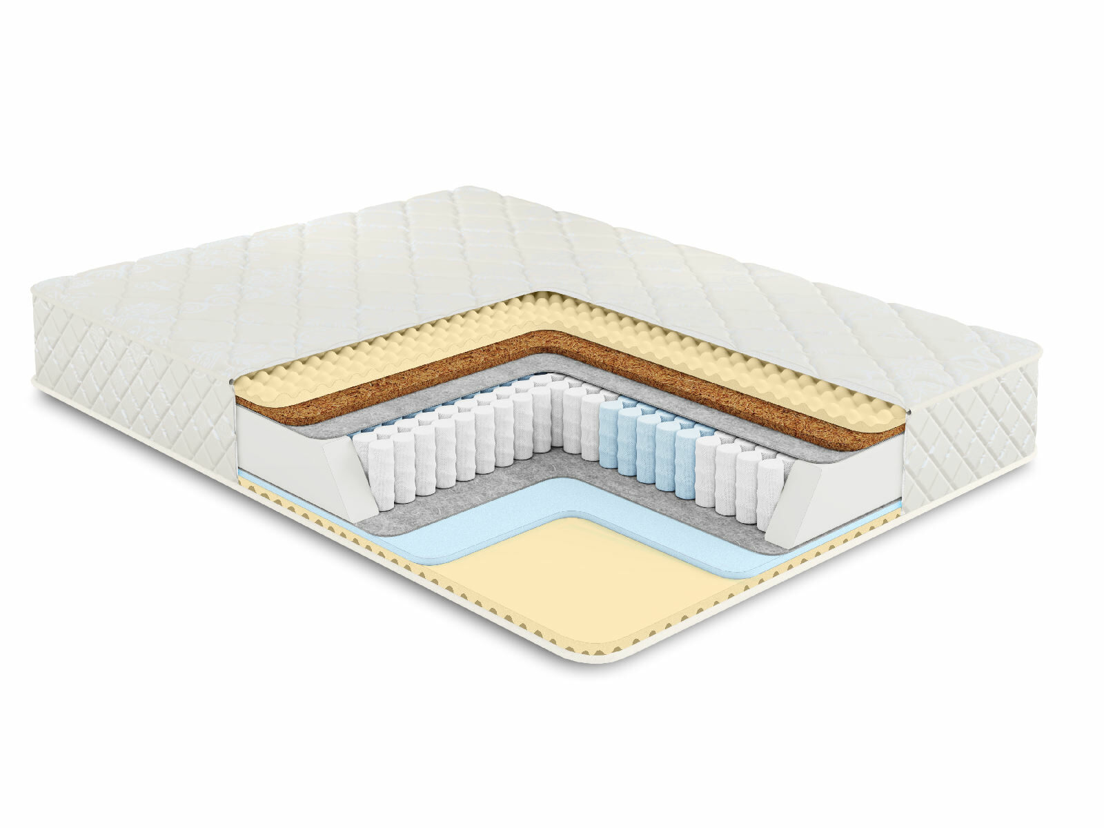 Пружинный матрас в основе которого многозональный независимый пружинный блок 1000 пружин на спальное место обеспечивает ортопедическую поддержку и комфорт во время сна. Независимые пружины подстраиваются под формы человека, потому что каждая пружина находится в отдельном кармашке и обеспечивает равномерное распределение веса.